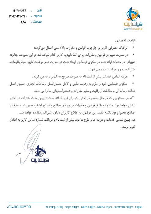 خرید اشتراک در واقع به منزله خرید دسترسی به محتواهای فیلمابین است. خرید اشتراک صرفاً جهت استفاده از سرویس فیلمابین است و هزینه اینترنت را شامل نمیشود. فیلمابین این حق را دارد در صورت صلاح دید بهمنظور کاهش هزینهها و جلوگیری از افزایش قیمت اشتراکها در هر بخش از محتوا، نسبت به پخش تبلیغات در ابتدای محتوا اقدام نماید. ممکن است در آینده تغییراتی در این توافقنامه ایجاد شود که شامل به حذف یا اضافهکردن مطالب و قوانینی به آن است که بلافاصله از نظر مسئولان سرویس لازم الاجراست؛ لذا کاربر موظف بهمرور قوانین طی استفاده از سرویس فیلمابین است تا از تغییرات احتمالی آن آگاه گردد. این تغییرات در شبکههای اجتماعی فیلمابین به اطلاع کاربران خواهد رسید.